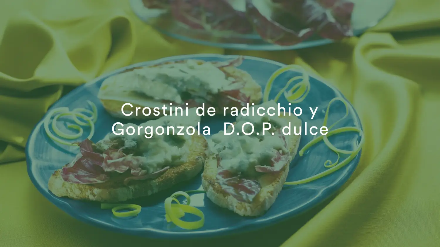 Mientras, salteamos las hojas de radicchio en una sartén, con una gota de AOVE, para que se ablanden un poco. Las colocamos sobre el pan y agregamos Gorgonzola D.O.P dulce al gusto. Terminamos dando a las tostadas otro toque de horno que deshaga ligeramente el queso, y servimos al momento. Son una auténtica delicia.